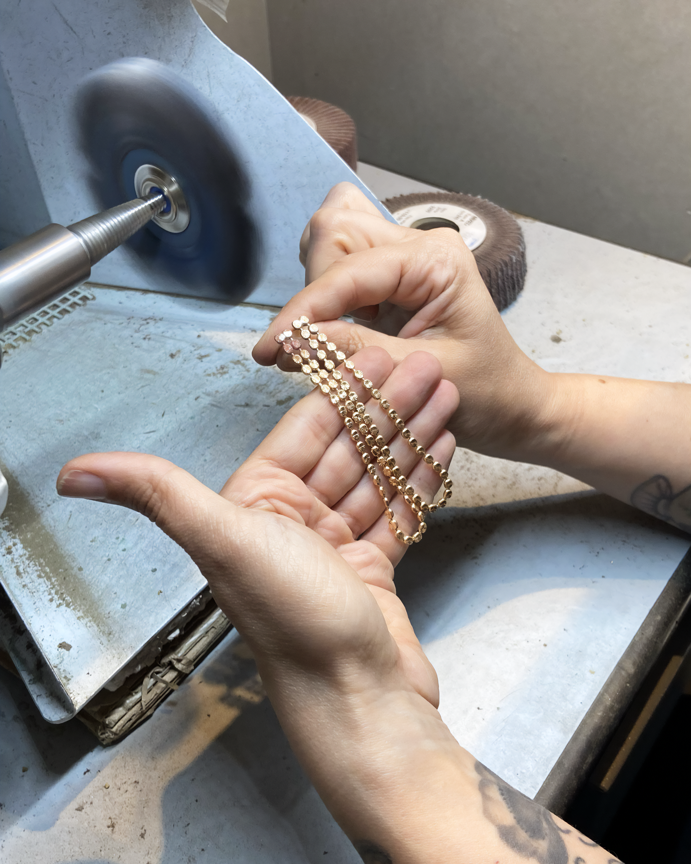 Pour limiter le gaspillage, nous gardons toutes les chutes de chaines, les prototypes, les fins de séries, pour les transformer en petites pièces uniques qui seront vendus à la boutique et sur le site lors des soldes.