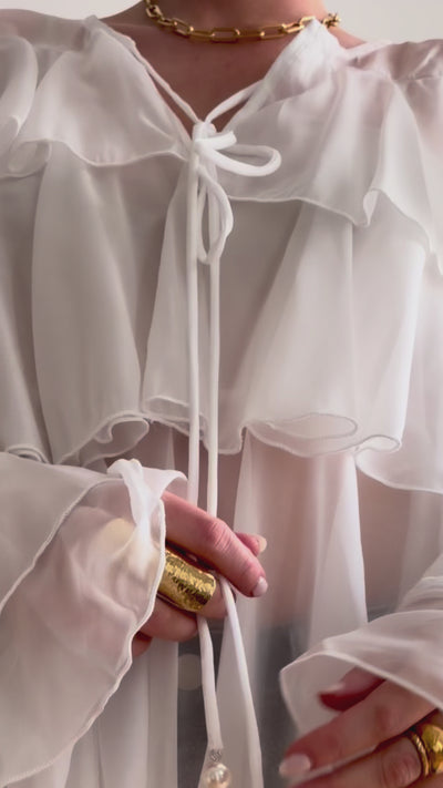 La blouse Rosalie incarne la féminité romantique et la légèreté aérienne. Son jeu de volants superposés crée un mouvement fluide et délicat, apportant volume et élégance à la silhouette. Son encolure arrondie sublimée par un lien à nouer ajoute une touche subtilement raffinée, tandis que sa matière vaporeuse accentue son allure douce et sophistiquée.
