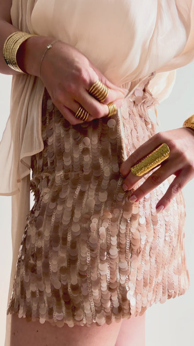 La jupe Gigi à sequins est une pièce lumineuse et féminine, idéale pour apporter une touche festive à vos looks. Sa coupe près du corps met en valeur la silhouette, tandis que sa longueur courte allonge joliment les jambes.