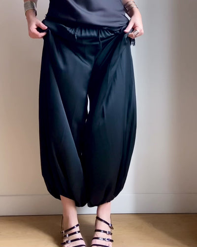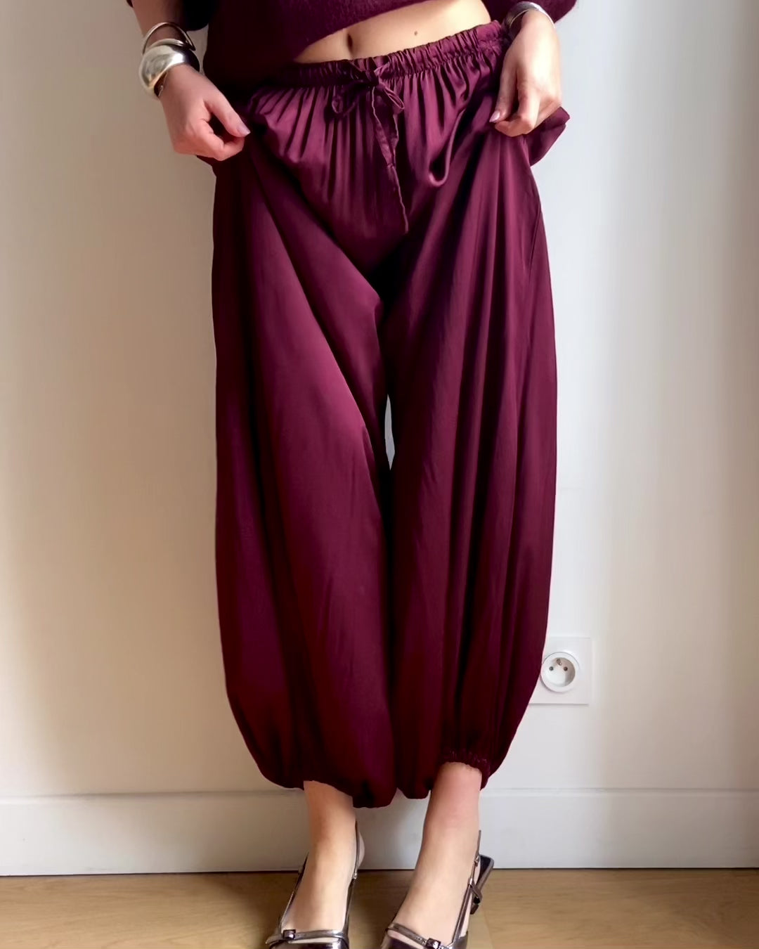Le pantalon Casa mise sur une allure chic et décontractée avec sa matière satinée et sa coupe fluide, subtilement resserrée au niveau des ourlets pour structurer la silhouette tout en restant confortable.