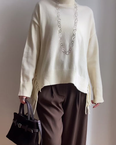 Un pull tout doux au style bohème chic, rehaussé de jolies franges pour une touche d’originalité. Son col roulé enveloppant et sa maille chaude (40 % viscose, 30 % polyamide, 20 % laine, 10 % cachemire) en font une pièce parfaite pour affronter les journées fraîches avec élégance.