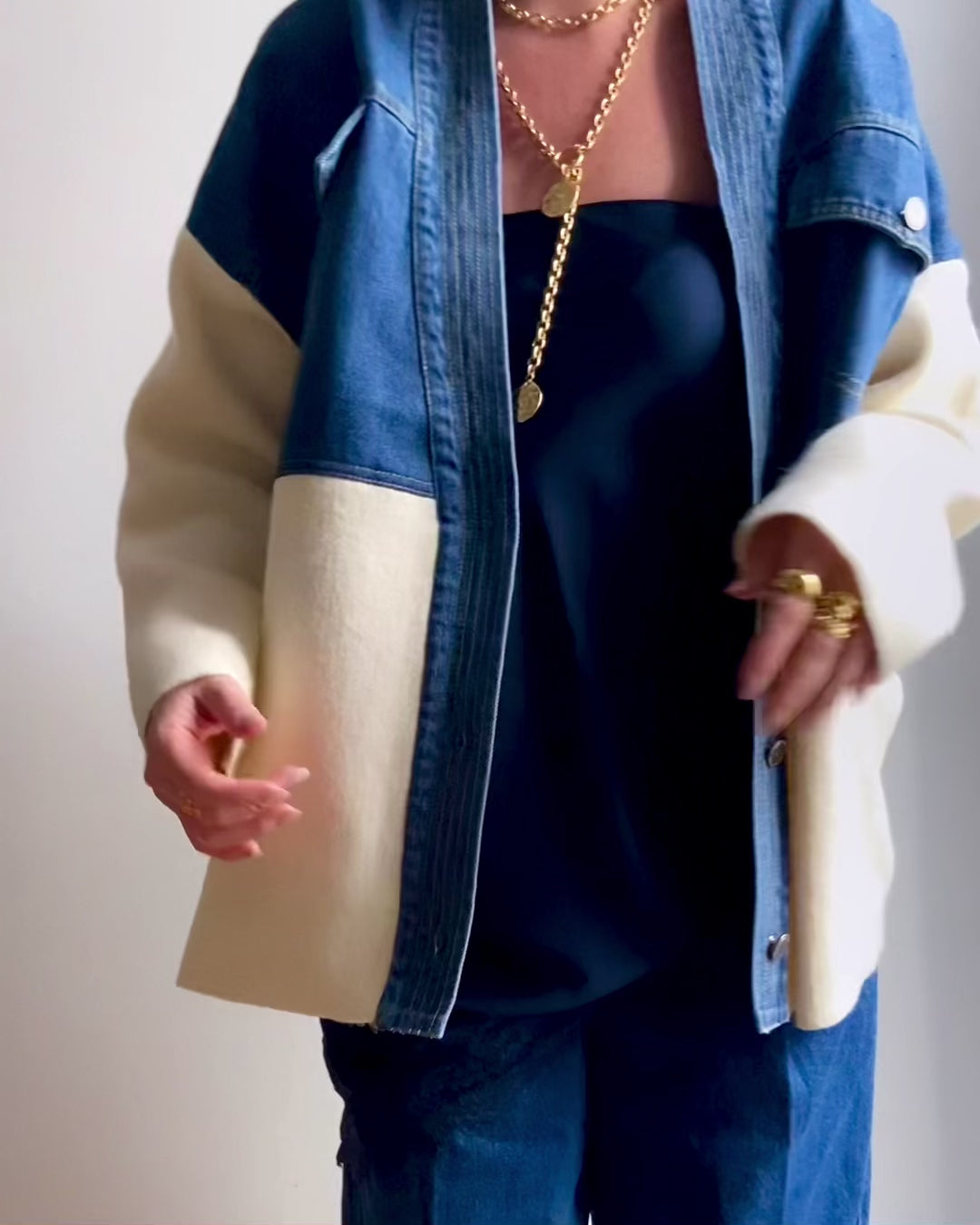 La veste Jude mixe les matières avec audace pour un look résolument tendance. Son haut en denim structuré apporte une touche casual et moderne, tandis que le bas en maille souple, composé de 40 % viscose, 30 % polyamide, 20 % laine, 10 % cachemire offre confort et douceur.